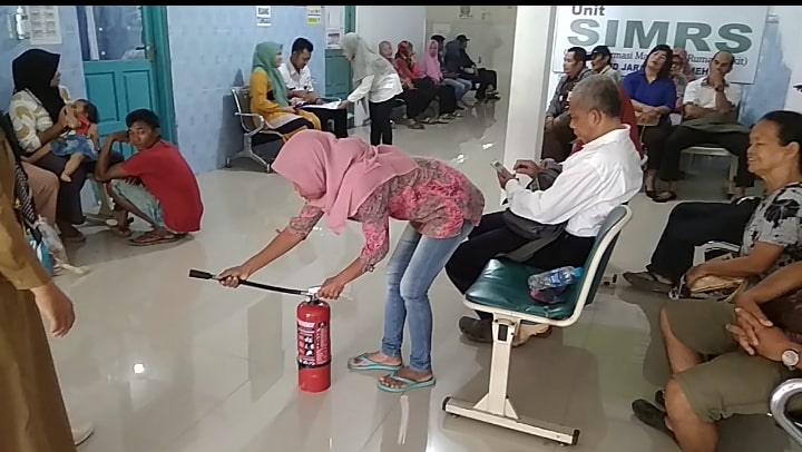 Petugas memberikan materi dan contoh penggunaan APAR kepada pengunjung Poliklinik RSUD Jaraga Sasameh