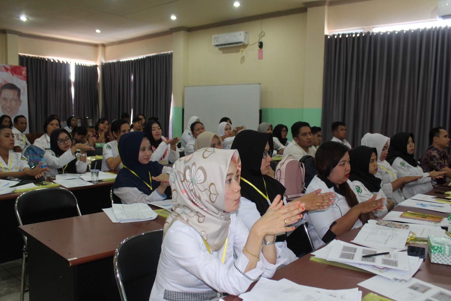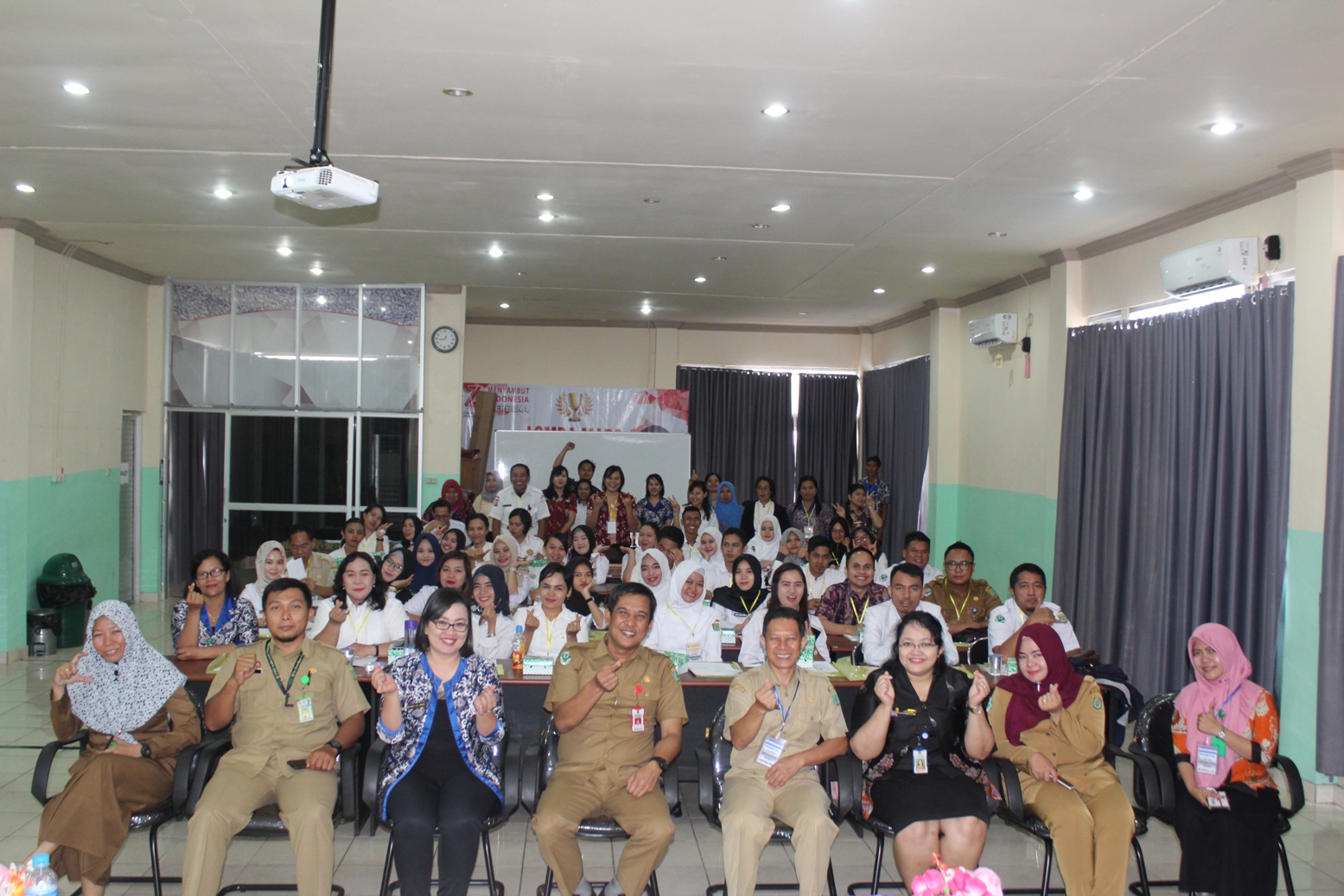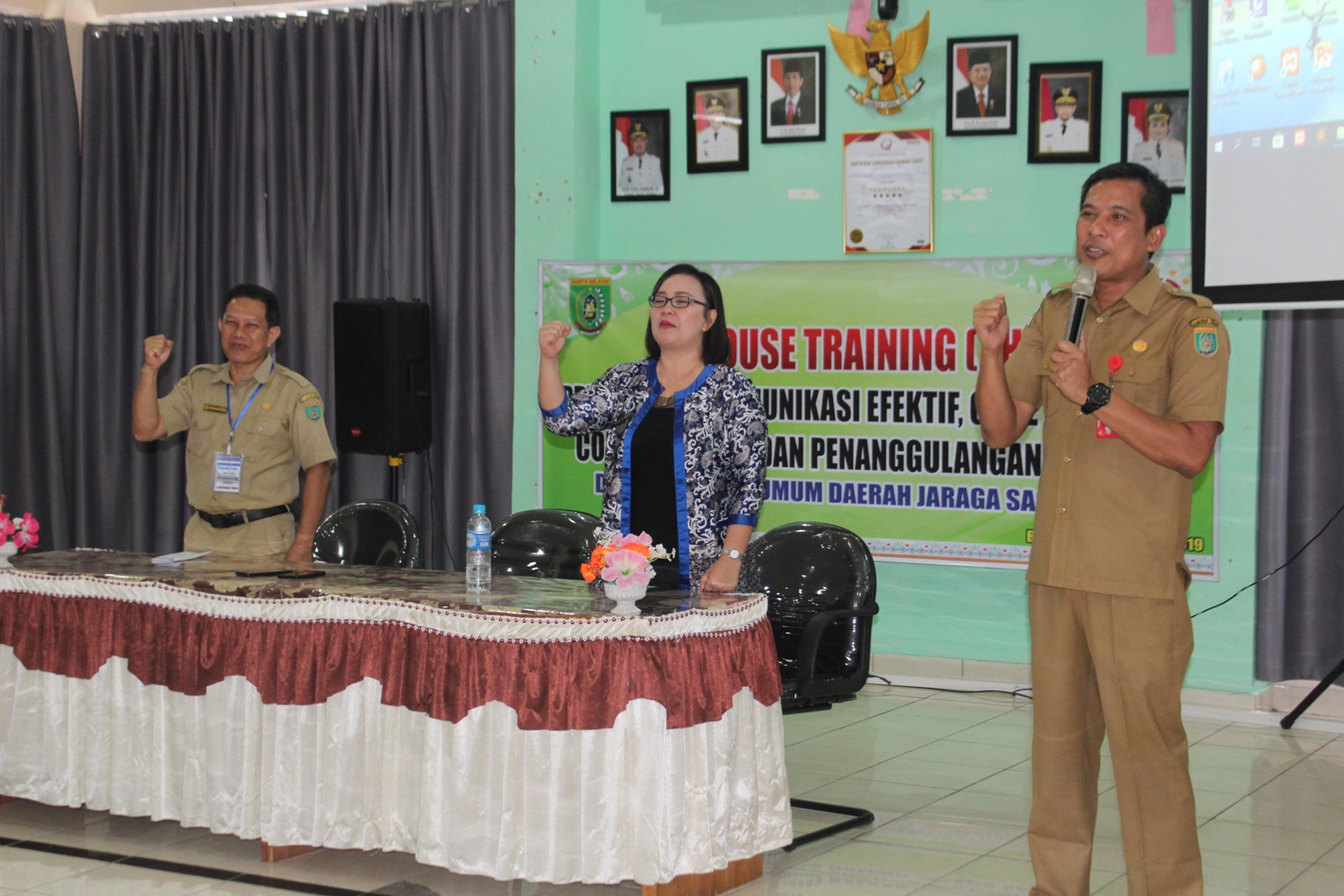 Penutupan acara IHT PPI, SKP, HPK, Komunikasi Efektif, Code Blue, EWS, Code Red, K3RS dan Penanggulangan Bencana dan seluruh peserta photo bersama dengan Direktur dan pejabat eselon 3 & 4 RSUD Jaraga Sasameh.